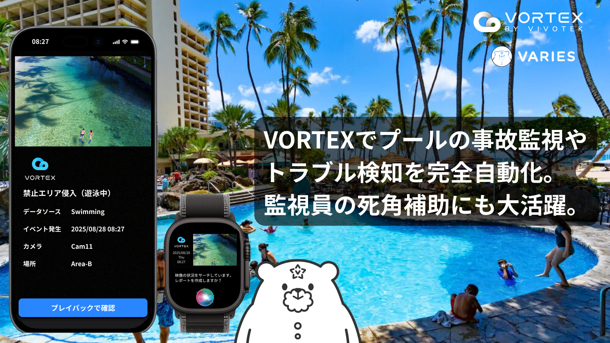リゾートホテルで最も恐ろしい事故の一つが、ライフガードのいない場所で起きる事故です。開放的なリゾートでは完全にフェンスで囲うことが難しく、水深の浅いリゾートプールでも突然の心臓発作や子どもの遊泳事故になりかねなかったケースが過去にたくさんありました。ライフガードの見回りは定時刻に行われるものの、ライフガードが見ていない場所で起きる事故の検知と監視は、カメラを使わないと本当に困難。そんな時にVORTEXならば、転倒検知機能や横たわり検知、人命に関わる事象の検知をしっかり取って、ライフガードや運営オフィスに通報。インシデントが起きると迅速な対応をし続けており、重大な事故は起きなくなっています。