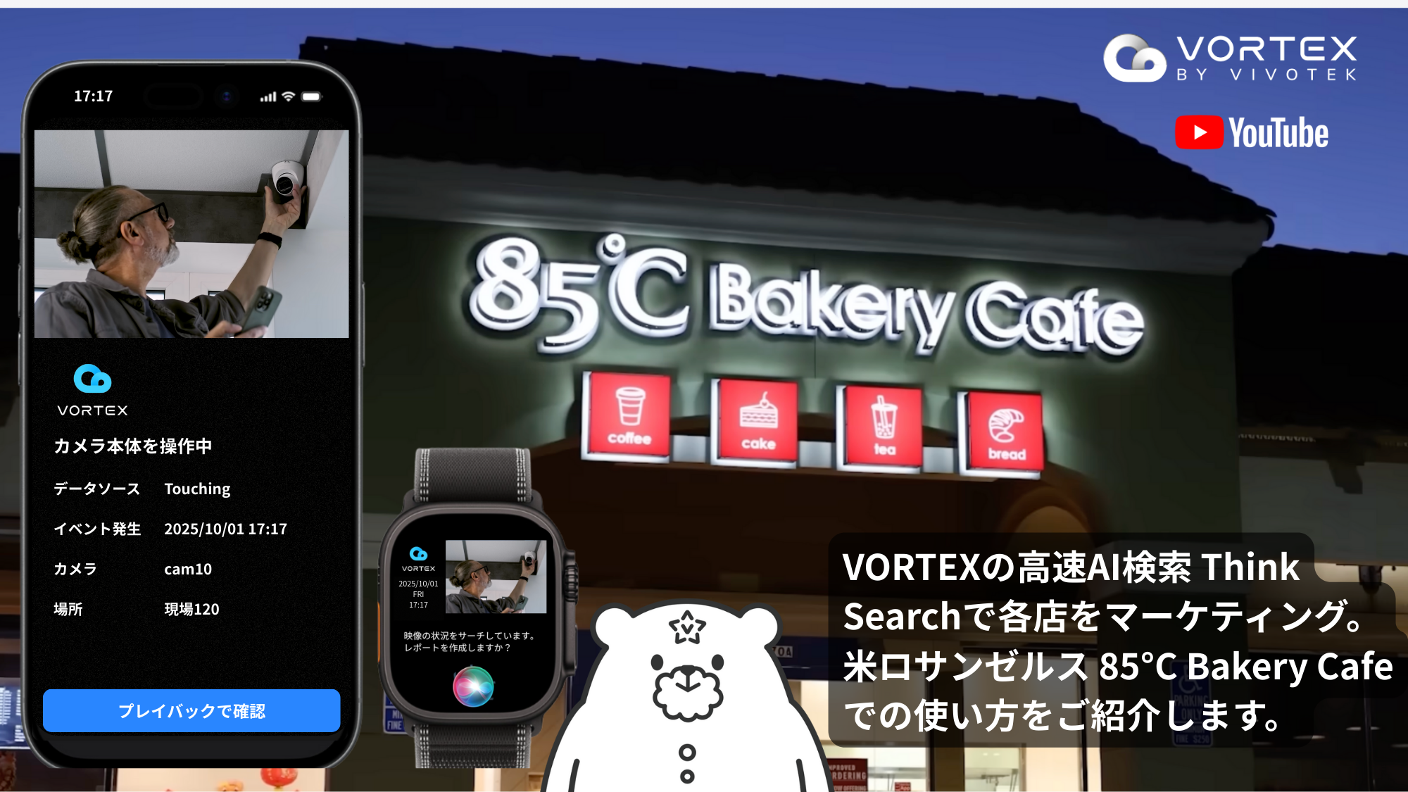 VORTEXカメラには高度なAI性能のほか、各現場の来店客、常連客、ブラックリスト客、トラブル事例などのデータ利活用に有効な機能が実装され、スマートフォンアプリやタブレット端末でいつでも現場をリサーチすることができます。こうしたマーケティングへの利活用に有効なカメラソリューションが人気を呈し、全米ではVORTEXカメラが次世代のスタンダードになりつつあります。特にVORTEXカメラのライブ映像や録画映像を自由言語検索で抽出できるThink Searchは、80店舗以上を経営する85°C Bakery Cafeにとっては、必需の機能となっています。