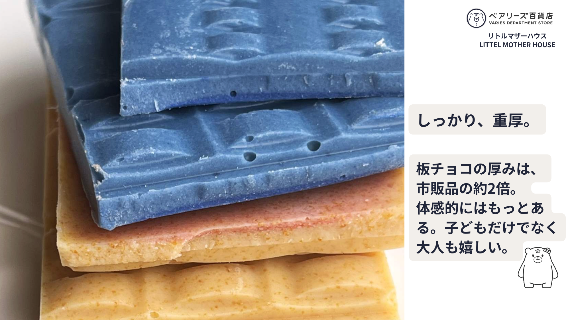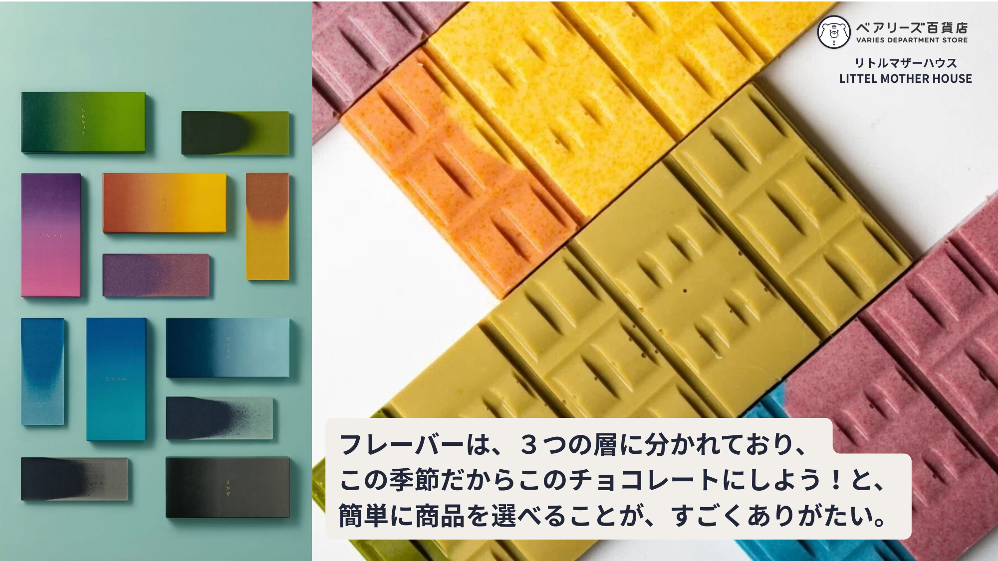 東京銀座で店舗を置く、自然由来の素材にこだわったリトルマザーハウスが作る板チョコレート IRODORI CHOCOLATE(イロドリチョコレート)は、2022年のリリース以来、多くの女性客やビジネスマンに大好評。全国の百貨店では、三越伊勢丹をはじめ、新宿京王百貨店、阪神梅田本店、大丸札幌店などでも販売しています。IRODORI CHOCOLATEは、アパレルブランド「マザーハウス」が手がけるチョコレート事業の賜物で、インドネシアの上質なカカオを用い、そこにリトルマザーハウスならではの「日本の和」を取り込んだ、斬新なグラデーションの板チョコレートになっており、1枚の板チョコの中で3層に混ざり合った素材の味と、芳醇なカカオの味を存分に楽しむことができます。