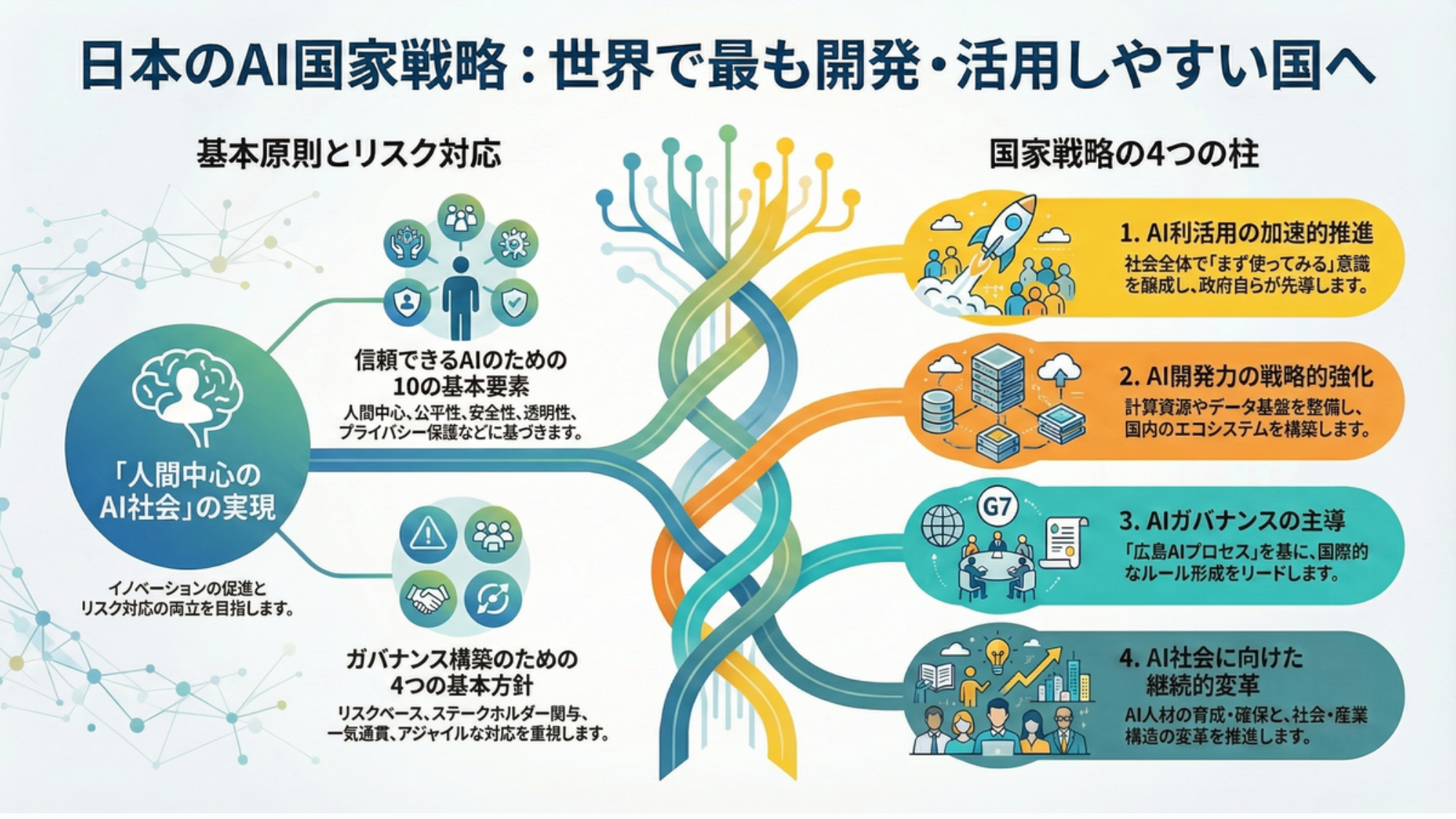 そして、国際的な枠組みである「広島AIプロセス」の主導を経て、現在策定されている人工知能基本計画では、イノベーションの加速とともに「信頼できるAI」の確立が最重要テーマとなりました。
