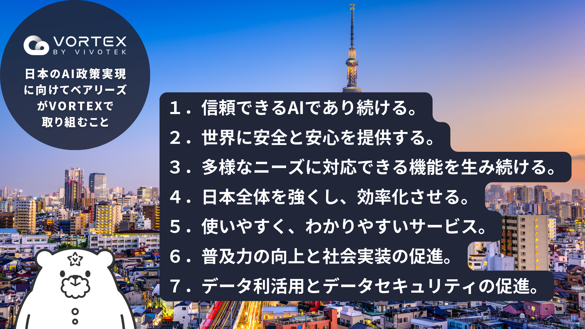 世界最高峰のAIクラウドカメラ「VORTEX」では、政府のAI政策実現のため、今後次の取り組みを徹底してまいります。