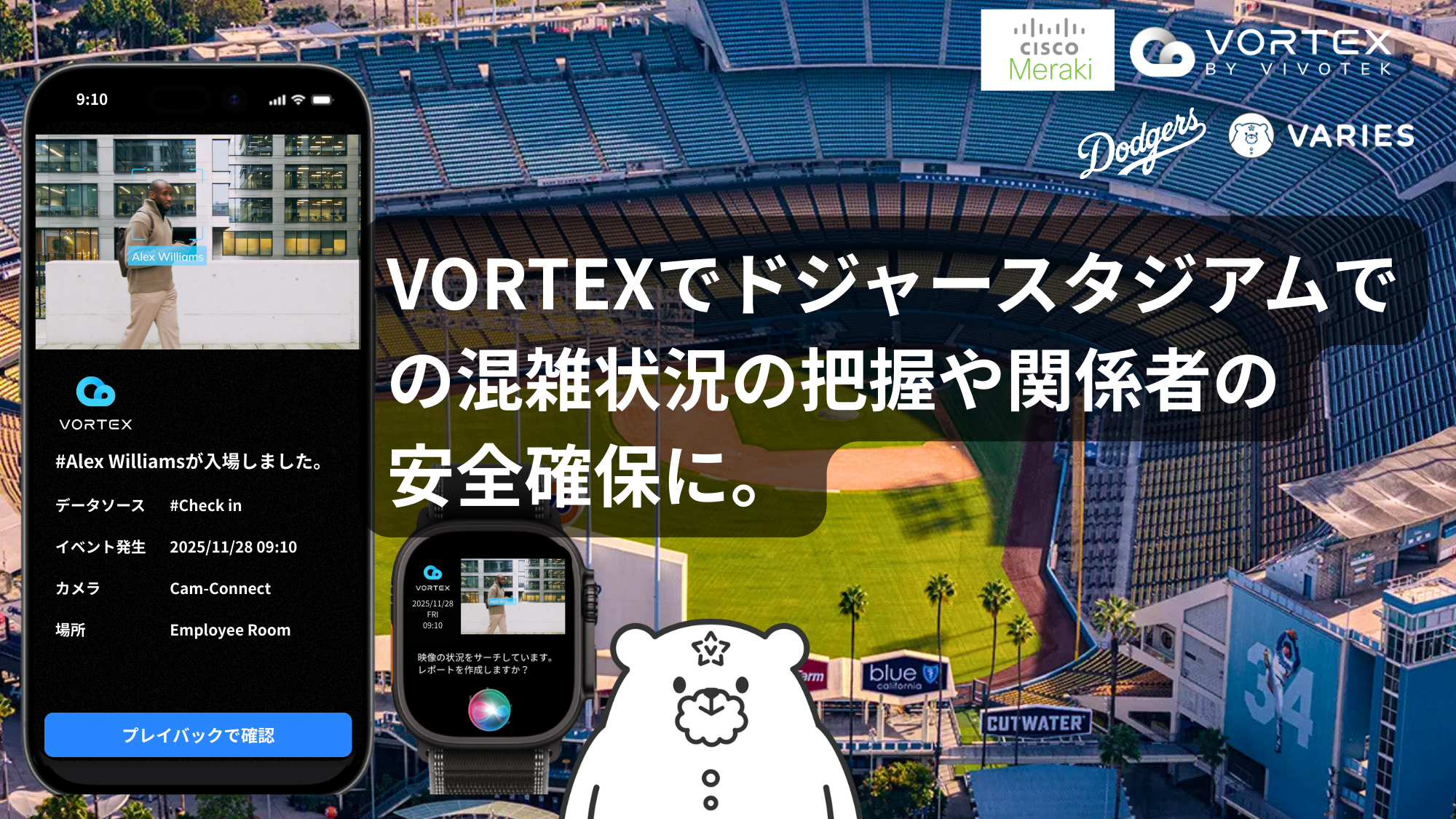 ドジャースタジアムのような世界クラスの施設で求められるのは、「止まらないシステム」と「即応性」です。サーバーダウンのリスクがなく、AIが瞬時にトラブルの芽を見つけ出すVORTEX。 VORTEXのクラウド映像ソリューションを活用すれば、世界一安全なスタジアムとして、VORTEXがその運営を支えることに貢献できます。